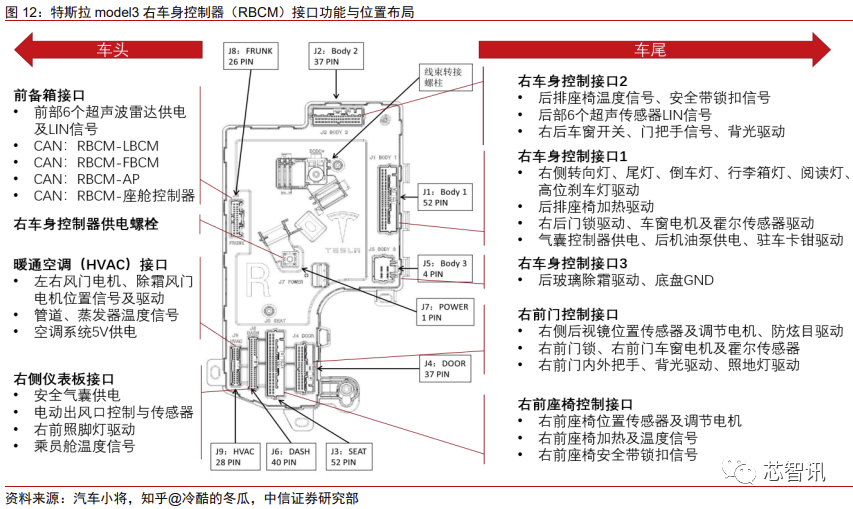 右车身控制器与左车身基本对称,接口的布局大体相同,也有一些不同点。右车身域 负责超声波雷达以及空调,同时右车身承担的尾部控制功能更多一些,包括后方的高位刹 车灯和后机油泵都在此控制。