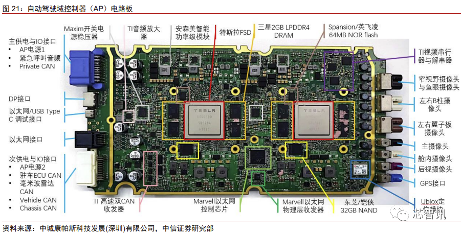 特斯拉的另一个重要特色就是其智能驾驶,这部分功能是通过其自动驾驶域控制器 (AP)来执行的。本部分的核心在于特斯拉自主开发的 FSD 芯片,其余配置则与当前其 他自动驾驶控制器方案没有本质区别。