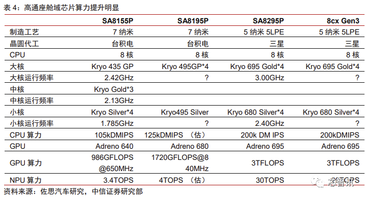 从特斯拉车机与游戏的不断靠拢我们可以看到未来座舱域的发展第一个方向,即继续 推进大算力与强生态。目前除特斯拉采用 x86 座舱芯片外,其他车企采用 ARM 体系较多, 但同样呈现出算力快速增长的趋势,这一点从主流的高通 820A 到 8155,乃至下一代的 8295 都能够得到明显体现。高通下一代座舱芯片 8295 性能基本与笔记本电脑所用的 8cx 相同。可以看到无论是特斯拉用的 AMD 芯片还是其他车企用的高通芯片,目前趋势都是 从嵌入式的算力水平向 PC 的算力水平靠拢,未来也有可能进一步超越 PC 算力。
