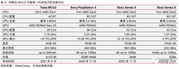 最新一代的特斯拉 MCU 配置已经与当前最新一代的主流游戏主机较为接近,尤其是 GPU 算力方面不输索尼 PS5 和微软 Xbox Series X。