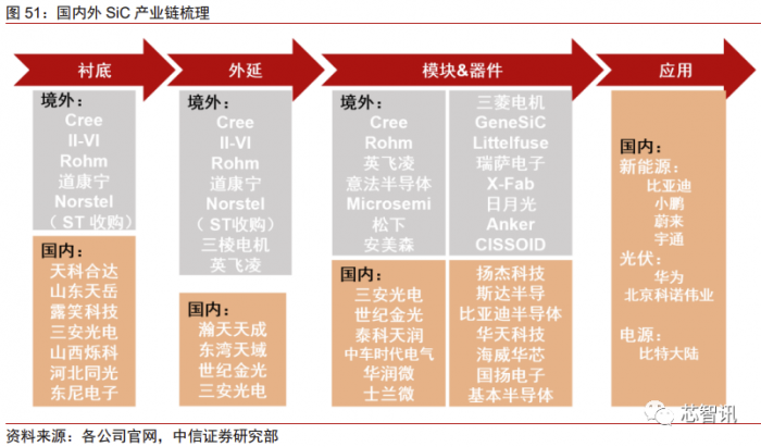 由于应用落地较慢,目前整个 SiC 市场仍处于发展阶段,国外厂商占据主要份额。根 据 Cree(现公司名为 Wolfspeed)数据,2018 年全球 SiC 器件销售额为 4.2 亿美元,预 计 2024 年销售额将达 50 亿美元。SiC 产业分链可分为衬底、外延、模组&器件、应用四 大环节,意法半导体、英飞凌、Cree、Rohm 以及安森美等国外龙头主要以 IDM 模式经营, 覆盖产业链所有环节,五家龙头占据的市场份额分别为 40%、22%、14%、10%、7%。国内三安光电、中车时代电气、扬杰科技、华润微等厂商以 IDM 模式经营,而天岳先进、 露笑科技、华天科技等厂商则专注于某一细分环节。