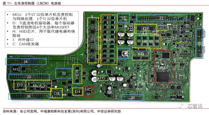 左车身域控制的核心芯片主要也分为控制和配电。核心控制功能使用两颗 ST 的 32 位 MCU 以及一颗 TI 的 32 位单片机来实现。左车身的灯具和电机比较多,针对灯具类应 用,特斯拉选用了一批 HSD 芯片来进行控制,主要采用英飞凌的 BTS 系列芯片。针对电 机类应用,特斯拉则选用了 TI 的电机控制芯片和安森美的大功率 MOSFET。