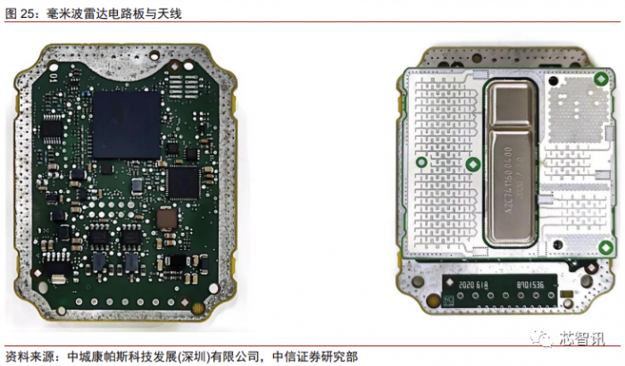毫米波雷达放置于车头处车标附近,包含一块电路板和一块天线板。该毫米波雷达内 部采用的是一颗 Freescale 控制芯片以及一颗 TI 的稳压电源管理芯片。