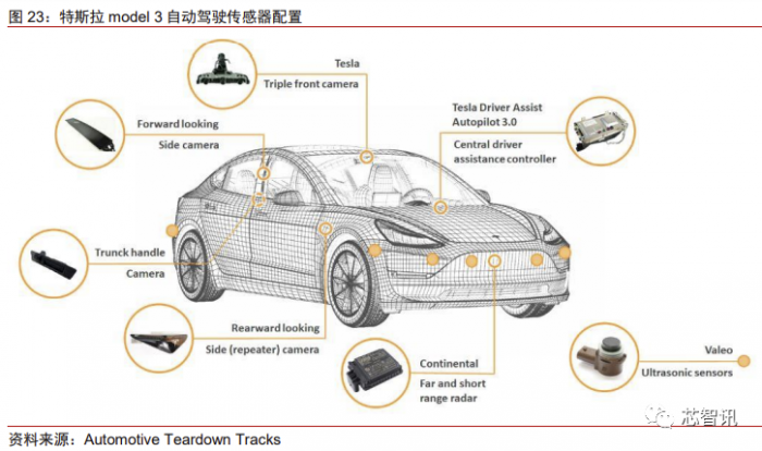 为了实现自动驾驶,特斯拉提出了一整套以视觉为基础,以 FSD 芯片为核心的解决 方案,其外围传感器主要包含 12 个超声传感器(Valeo)、8 个摄像头(风挡玻璃顶 3 个前 视,B 柱 2 个拍摄侧前方,前翼子板 2 个后视,车尾 1 个后视摄像头,以及 1 个 DMS 摄 像头)、1 个毫米波雷达(大陆)。