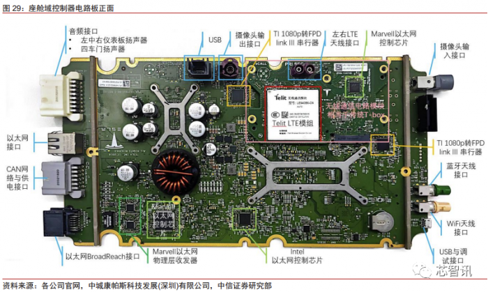 座舱域是用户体验的重要组成部分,特斯拉的座舱控制平台也在不断进化中。本次拆 解的特斯拉 model 3 2020 款采用的是第二代座舱域控制器(MCU2)。