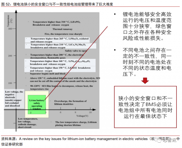 BMS 的第二大难点在于,不同的锂电池之间必然存在不一致性。这种不一致性就导 致同一时间,在同一电池组内,不同的电池仍然工作在不同的温度、电压、电流下。如果继续用一张图来描述,就代表着不同电池处在图上的不同位置。而要保证电池组的安全高 效运行,就意味着诸多电池所在的点位必须同时处于狭小的安全窗口内,这就导致电池数 量越多,管理就越困难。