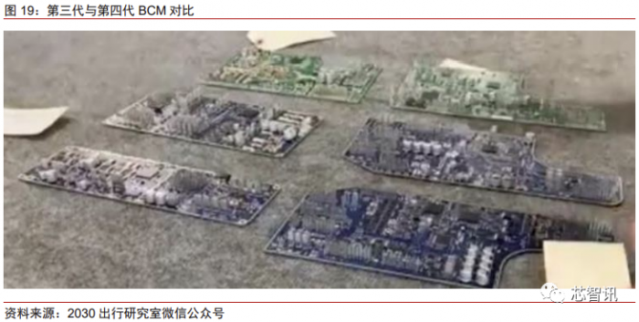 从特斯拉车身控制器能够体现出的另一个发展趋势是器件的持续集成和持续降本。早 期版本的 model S 和 model X 并无如此集中的车身控制器架构,但如今较新的 model 3 和 model Y 已经体现出集成度增加的趋势。左下图中我们可以看到,作为第三代车身域控 制器产品,model Y 的车身控制器已经与第一代的 model 3 有所不同,直观上就是其元器 件密度有所增加。比如图中的 MOSFET(黑色小方块),model Y 的间距明显要比 model 3 更小。因此,在同样的面积下,控制器就能容纳更多元件,融合更多功能。另外,与现有 的 model 3 不同,model Y 控制器的背面也被利用起来,增加了一定数量的元器件,这使 得控制器的集成度进一步提高。集成度提高的结果就是车身电子电气架构的进一步简化, 汽车电子成本的进一步降低。