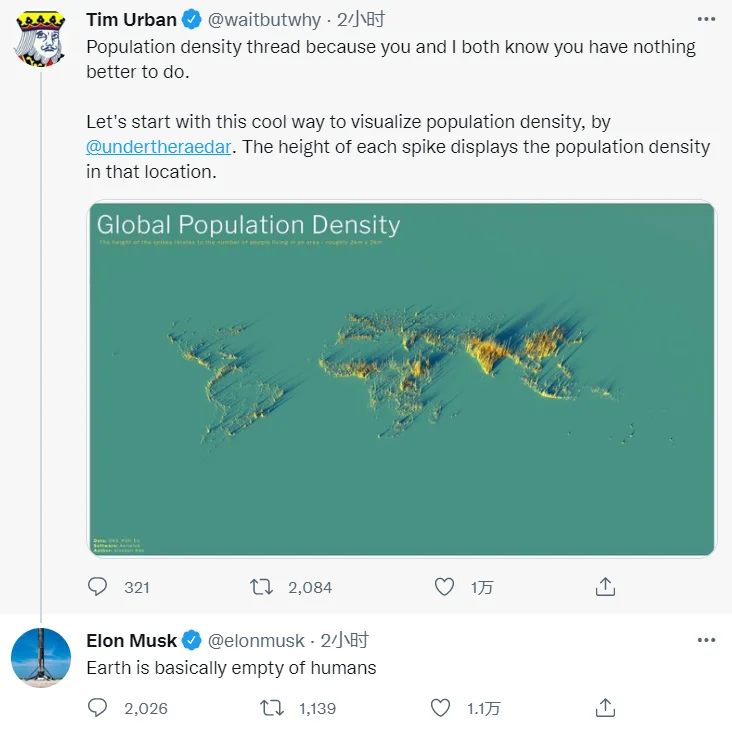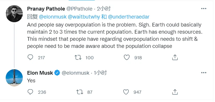 一位网友发推文称,很多人说人口过剩是问题所在,但他并不同意,地球有足够的资源,基本上可以维持目前人口的2到3倍,人们认为人口过剩的想法需要转变。特斯拉CEO马斯克回复表示赞同,并在同一个话题下发表言论称地球上人类还很少。