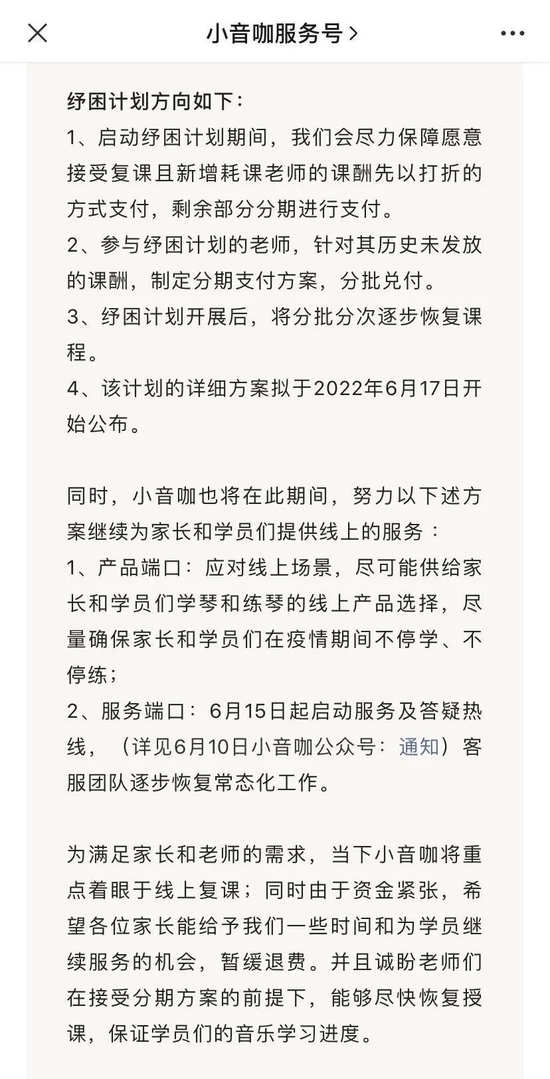 6月13日,李艾在官方公众号发文,称针对历史未发放的课酬,正制定分期支付方案,尽力保障愿意接受复课的老师课酬,对于新增耗课,老师的课酬先以打折的方式支付,剩余部分分期支付,同时希望家长“暂缓退费”。
