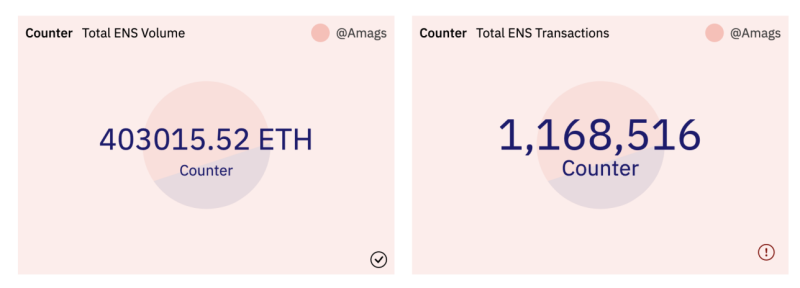 近月加密货币市场迎来寒冬,但ENS域名买卖热度未减。据区块链分析平台Dune Analytics,当前 ENS 域名注册量已突破116万,据NFTGo.io,ENS市值达6891万美元,同比五月已增50%市值。