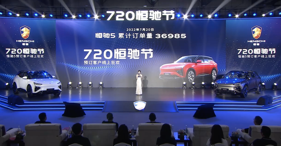 除了迷幻的抽奖环节,本次发布会上最引人关注的,便是现场大屏幕上方不断蹦跳上升着的“恒驰5累计订单量”。