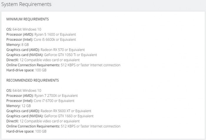 最低配置为AMD Ryzen 5 1600或英特尔酷睿i5 6600K CPU,AMD Radeon RX 570或NVIDIA GeForce GTX 1050Ti。