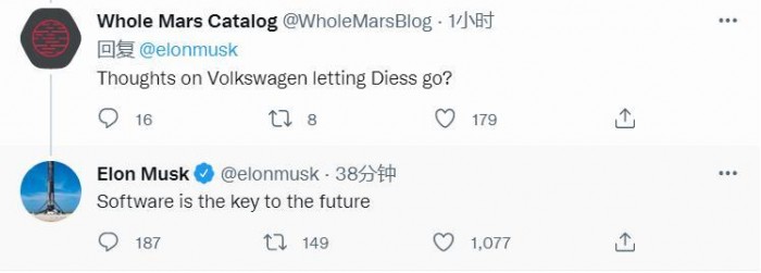 北京时间7月24日,马斯克在推特上发表对于大众CEO迪斯离职的看法,称“软件是通向未来的关键”。据悉,迪斯离职的原因很可能是软件开发失利,而迪斯曾多次表示,大众集团只有加强软件开发能力才能超过竞争对手特斯拉。