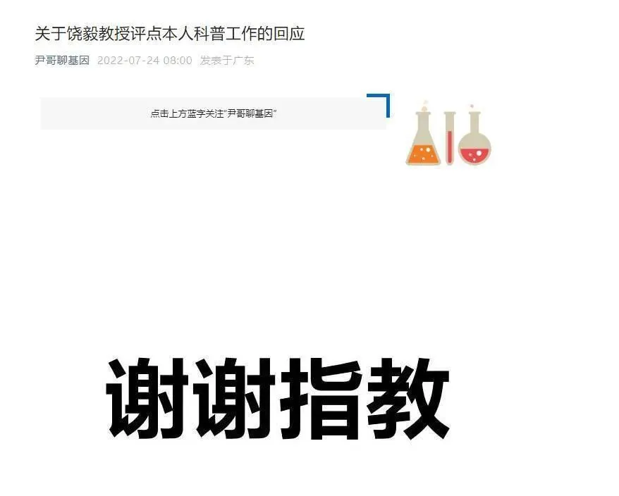 针对饶毅的指责,尹烨在其公众号“尹哥聊基因”中做了极其简短的回应:“谢谢指教”。