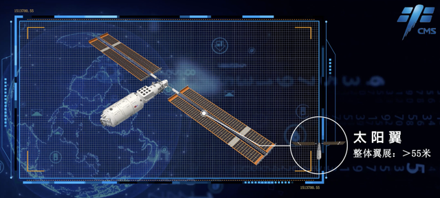 配置双自由度柔性太阳帆板一对,全部展开后翼展超55米,比半个足球场更长,单个有效发电面积约110平方米,相当于一套三室一厅。