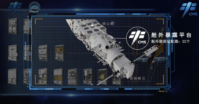 外部看上去像方形的外壳,是舱外暴露实验平台,上面配置了22个标准载荷接口,其中一部分还配备了流体回路温度控制。