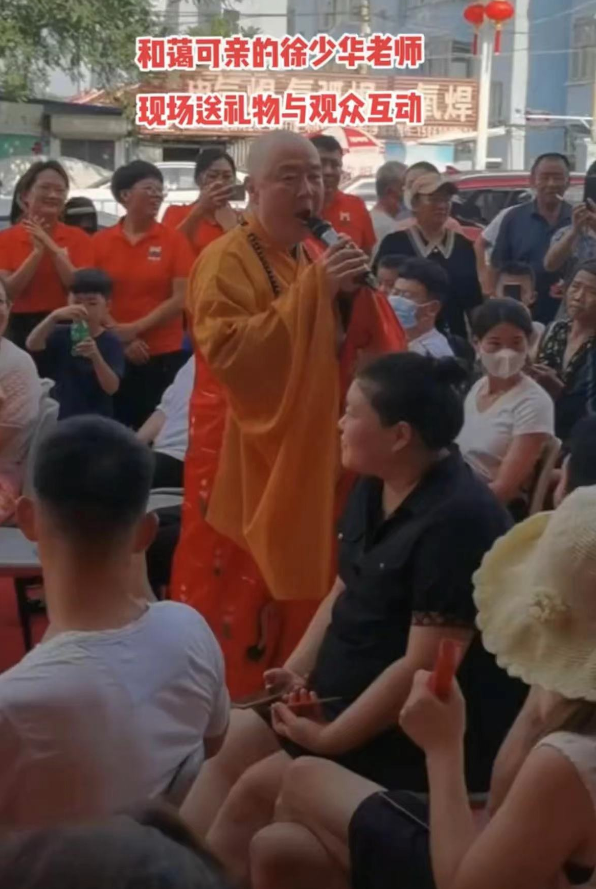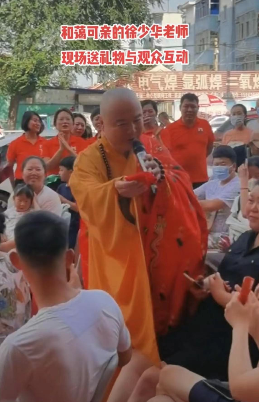 当天,烈日当头,徐少华一身唐僧装扮,穿着袈裟,脖子上带着一大串的佛珠,也是光头的造型,就宛如《西游记》中的唐僧出现在观众眼前,他手拿话筒,唱着《西游记》的插曲《女儿情》,非常的和蔼可亲,很是接地气。
