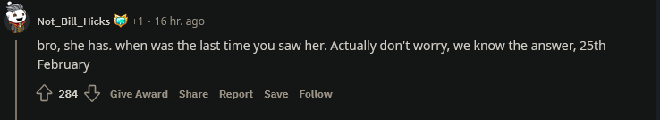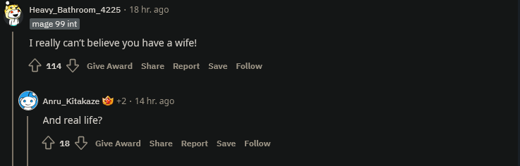 一个回应表示“你老婆大概已经离开了,只是你不知道而已”,然后他继续打趣说道:“上一次你见到你老婆是什么时候……不用说,是2月25号对吧(《艾尔登法环》发售日)。”
