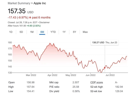 今年以来,在科技股估值集体暴跌的情况下,苹果可以说是表现最稳定的公司。在纳斯达克指数跌超22%,大量科技成长股腰斩,微软、Google、亚马逊等巨头都跌超25%以上的情况下,苹果过去六个月仅跌了约10%左右。