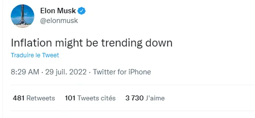 7月29日消息,在全球面临通胀背景之下,特斯拉CEO埃隆·马斯克发布推文预测,称通货膨胀可能有下降趋势。针对马斯克的经济预测,也有网友不买账,反驳称:“如果我们重新定义什么是通胀的话。”