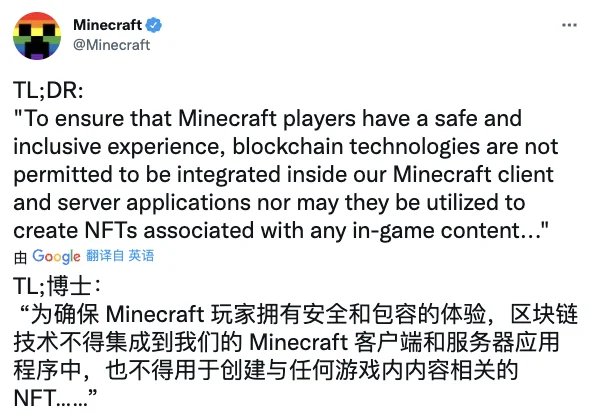 根据官方公告来看,Minecraft 团队认为如今的 NFT 项目是为了创造数字所有权,会人为地制造稀缺性和排他性,这和 Minecraft 本身包容的价值观完全相反。