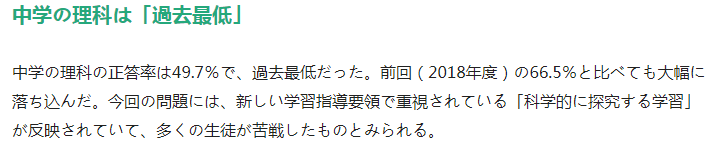 ·根据公告,在所有公立小学中,国语与理科是秋田县排名第一,数学则是石川县第一,而中学的理科成绩正确率仅有49.7%,创下历年最低,上次2018年的测试为66.5%。