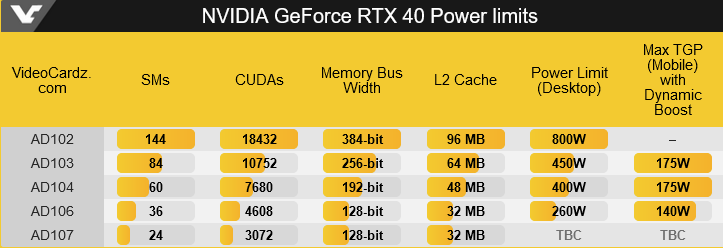 规格方面,AD106核心预计打开36组SM单元,也就是4608个CUDA,二级缓存增加到32MB,峰值功耗260W;AD107则是24组SM单元,对应3072个CUDA,二级缓存同样增加到32MB。