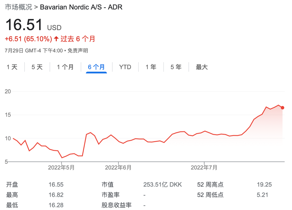 一时间全球哗然,猴痘疫情浪潮成为所有人关注的焦点。与此同时,一家名为巴伐利亚北欧(Bavarian Nordic)的丹麦公司,也借此迎来了专属自己的高光时刻。