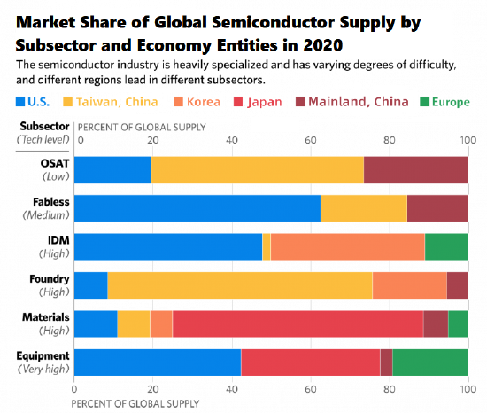 Foundry制造环节份额,主要由美国、韩国和中国台湾三个经济体瓜分。而其中大部分的先进制程半导体也都只能交给他们生产。
