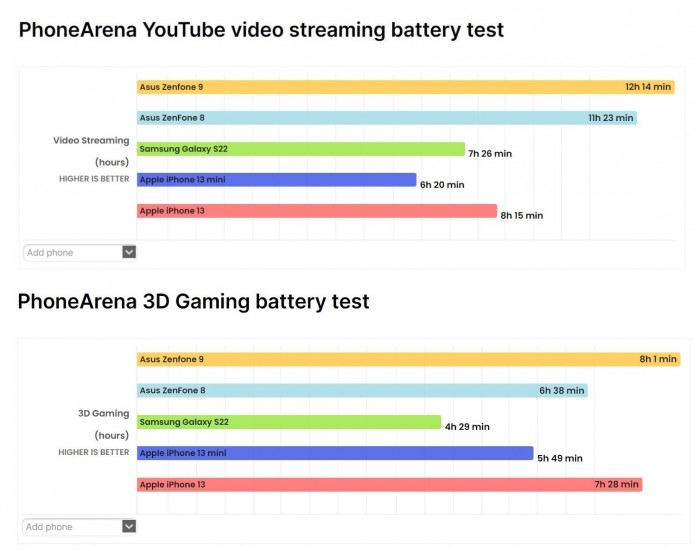 在YouTube视频播放测试环节,华硕Zenfone 9续航长达12小时14分钟,轻松击败iPhone 13、三星Galaxy S22,iPhone 13 mini自然也被碾压。