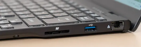 虽然重量轻,但是这款笔记本并没有在端口数量上有所牺牲。该笔记本配备了 1 个读卡器、3 个 USB 端口、1 个完整的 HDMI 端口和网线端口、以及同时作为指纹传感器的电源按钮。