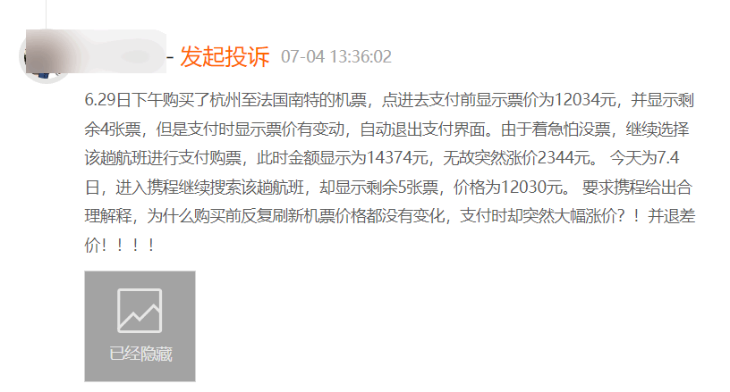 黑猫投诉上,有用户投诉称,6月29日杭州至法国的机票,点进去支付前显示票价为12034元,并显示剩余4张票,但是支付时显示票价有变动,自动退出支付界面。