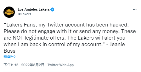 珍妮·巴斯在推特上有43万的粉丝,有些人发现了这条推文端倪,其并未明确的说明合作慈善机构的具体信息,提供的汇款账户也存在异常。珍妮·巴斯在发现账户被盗后,通过湖人队的官方账号说明了此事。目前她已经重新登陆账号,并删除了这条诈骗推文。