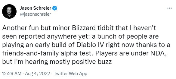 之前PlayStation Game Size爆料称,《暗黑破坏神4》PS4/PS5测试版已添加到PlayStation数据库中,应该是Beta试玩版,或即将推出。现在业内知名记者Jason Schreier发推文称,《暗黑破坏神4》早期版本已发给与暴雪关系密切的一些测试人员,许多人现在在试玩暗黑4早期版本。