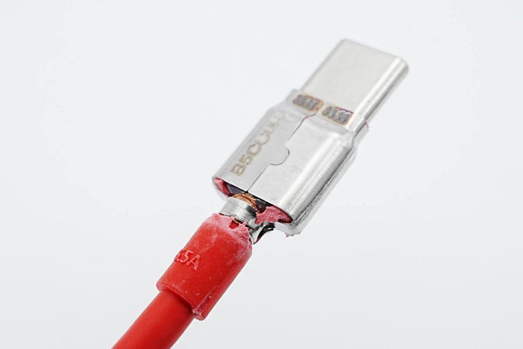 充电头网通过拆解了解到,一加这款6.5A快充CC线采用了定制USB-C端子,相比普通USB-C端子触点更宽,更厚,接触电阻也更低。USB-C端子点焊钢套固定,内部注塑填充空隙,数据线焊点涂胶绝缘。线缆整体做工优秀,品质可靠。