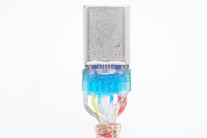 将数据线剪开观察截面,其中两条红色线芯为正极电力线芯,黄色为VCONN线芯,蓝色为CC线芯,白绿为USB2.0线芯,裸线芯为负极,线芯内部均填充抗拉线增加强度。