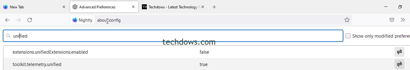 搜索unified,在显示的结果下,将"extensions.unifiedExtensions.enabled"预设值切换为"true"来启用。