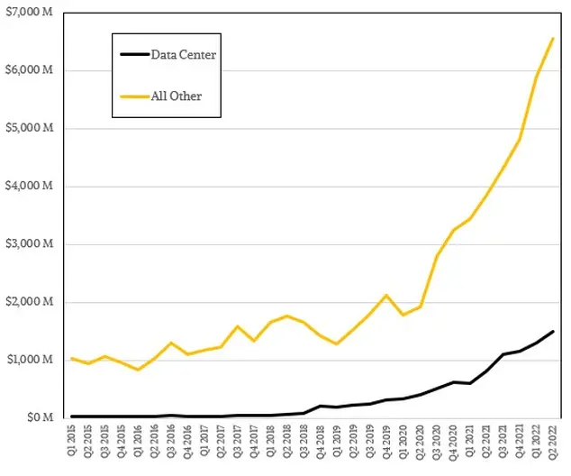 虽然英特尔的数据中心和人工智能事业部(至强 CPU)同比下降 16%,但 AMD 的数据中心收入同比增长 83%。随着越来越多的客户倾向于 AMD 的 EPYC(霄龙)CPU,例如 Rome、Milan 和 Milan-X,该公司已经能够彻底改变服务器格局。他们可能仍占据整个 x86 服务器 CPU 份额的四分之一,但鉴于第一款 EPYC 芯片发布仅五年时间,这是一个巨大的里程碑。