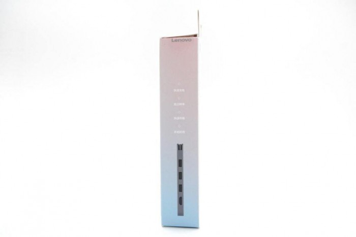 包装盒采用白灰各半的配色设计,正面为拓展坞外观图示,顶部为拓展坞的名称字样,并且印有小新的品牌Logo及右下角的联想Logo。