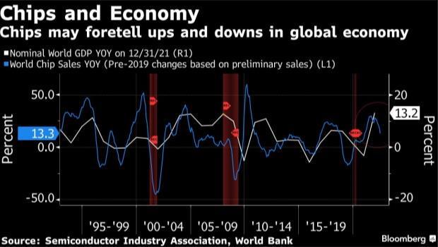 芯片销售之所以开始降温,是因为各国央行开始争相加息以对抗螺旋式上升的通胀。彭博经济(Bloomberg Economics)进行的一项全球跟踪显示,今年世界经济前景迅速恶化,芯片销售也随之放缓。