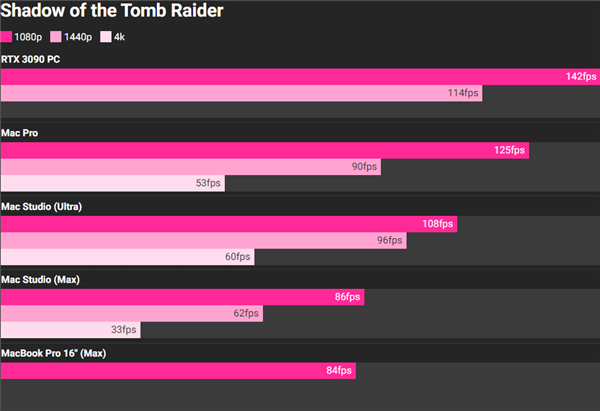 当然,苹果这么自信也不是没有道理的,自从自研处理器之后,Mac平台的GPU性能及软件/游戏开发也在不断完善,M1 Ultra号称GPU性能超过RTX 3090,实测当然有所不如,差了一半性能,然而这样的性能依然让人觉得恐怖,厂商应该很明白这样的性能未来会是什么结果。