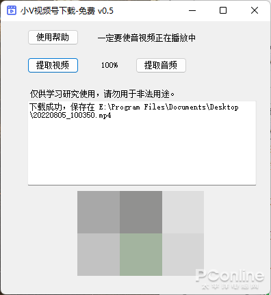 然后打开这个小 V 视频号下载工具只有100多K的小工具,把刚刚复制的内容粘贴上去,按下“提取视频”按钮后稍等片刻,很快你就会看到成功提取视频提示。下载回来的视频就保存在小 V 视频号下载工具程序存储同一目录下。需要注意的是,复制内容时一定要是的音频、视频文件正处于播放状态,否则可能会导致下载失败。