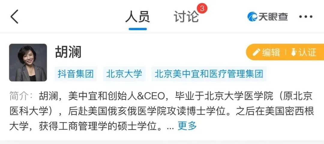 美中宜和的故事,始于一位归国女博士胡澜。资料显示,胡澜毕业于北京大学医学部(原北京医科大学),后赴美国于俄亥俄医学院,攻读博士学位。除了医疗专业以外,胡澜随后还在美国密西根大学获得工商管理学的硕士学位。
