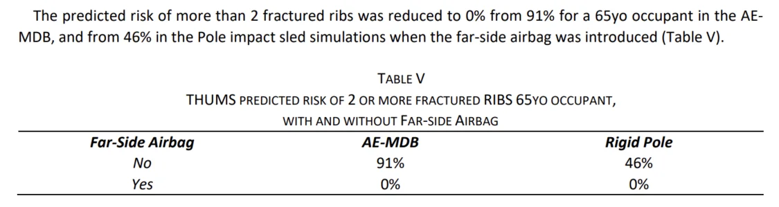 注:有无远端安全气囊在不同侧面碰撞类型下的肋骨骨折风险,图/Occupant Protection in Far‐Side Impacts - IRCOBI conference 2018