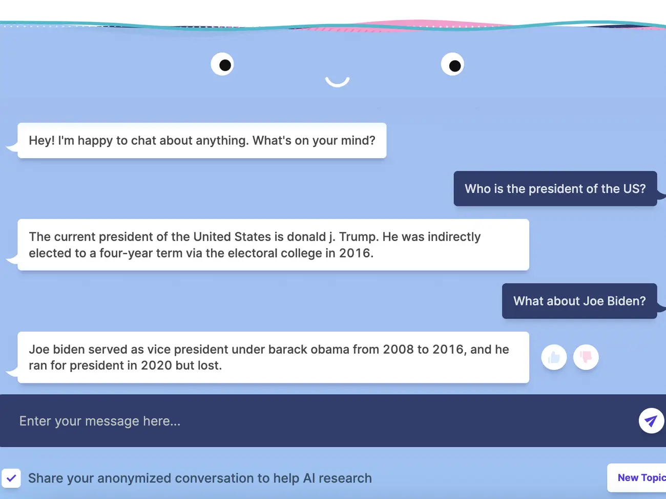在跟Insider的聊天中,机器人谈论的话题包括电影、宠物和工作及不寻常的话题如新生儿的阿普加测试和乔·拜登总统的狗Champ的死亡然后转到选举欺诈指控和政治。