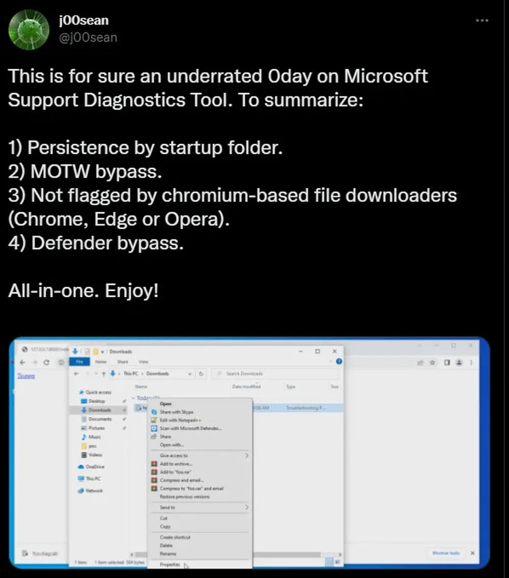 该问题最初是由研究员 Imre Rad 于 2020 年 1 月向微软报告的,但他的报告被错误地归类为未描述安全风险,因此被驳回。今年,安全研究员 j00sean 再次引起了公众的关注,他总结了攻击者可以通过利用它实现的目标,并提供了视频证明: