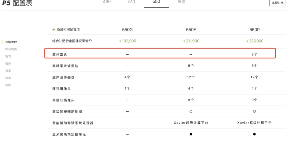 而且,值得注意的是,根据车主自述,涉事P7为XPILOT 2.5版本——相当于低配版的辅助驾驶能力,采用的单目摄像头+前置毫米波雷达的方案。相比之下,XPILOT 3.0版本,采用了三目摄像头,整车的高感知摄像头数量达到9个,高精毫米波雷达的数量也达到了5个,比2.5版本多了2个。