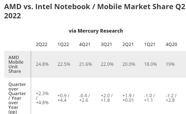 移动笔记本市场,AMD份额环比增加2.3个百分点,来到24.8%。