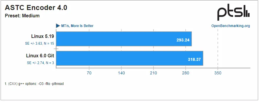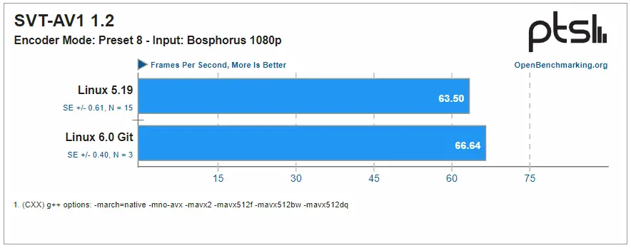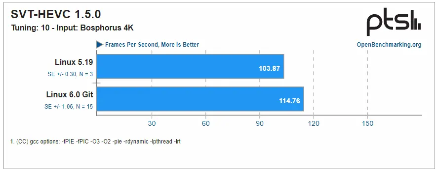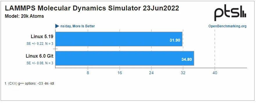 在 Linux 6.0 中增加了 SVT 视频编码,Larabel 指出他在之前的测试中没有目睹这种情况发生。 LAMMPS 是一项 HPC 工作负载测试,在新的 Linux 中越来越好,并且还增加了几个多线程工作负载。