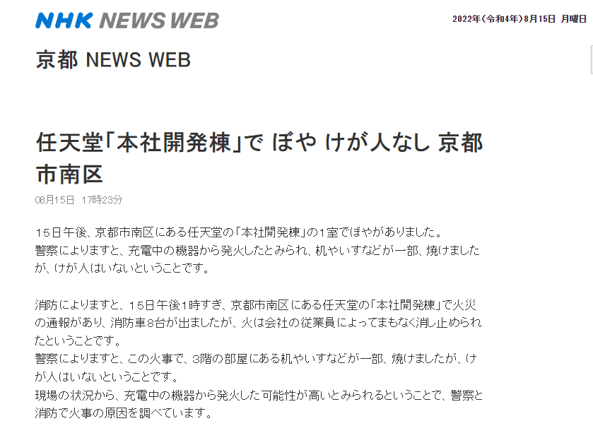 据NHK报道今日(8月15日)下午,位于京都市南区任天堂总部的本社开发中心(本社開発棟)的一个房间里,发生了一场火灾。现场部分桌子和椅子被烧毁,但没有人员受伤。